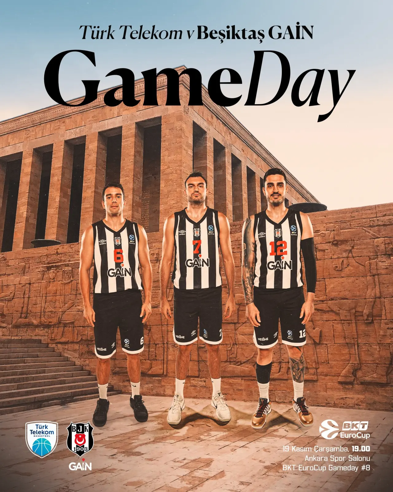 Beşiktaş GAİN, BKT EuroCup’ın 8. haftasında bugün Türk Telekom ile karşı karşıya gelecek. Siyah-beyazlılar, Ankara Spor Salonu’nda oynanacak bu önemli mücadelede sahaya galibiyet hedefiyle çıkıyor. Taraftarlar, Avrupa arenasında kritik bir viraja giren takımın performansını merakla bekliyor. Beşiktaş Gain'in maç günü kapağında Anıtkabir detayı dikkat çekti.