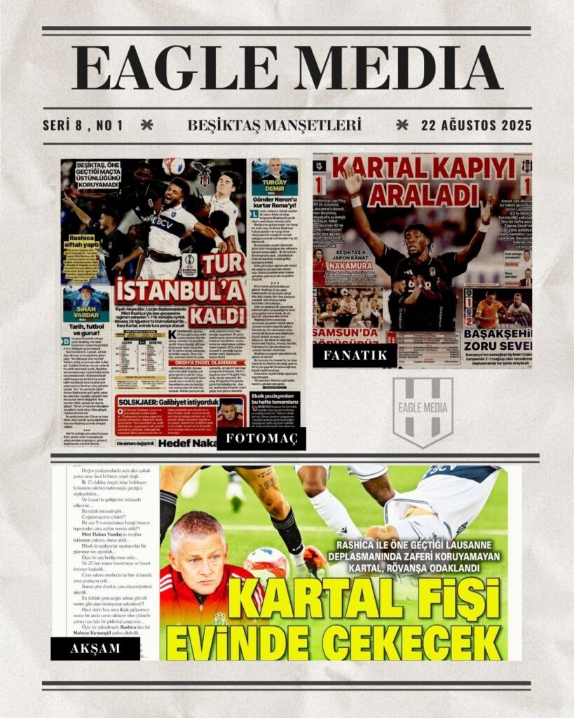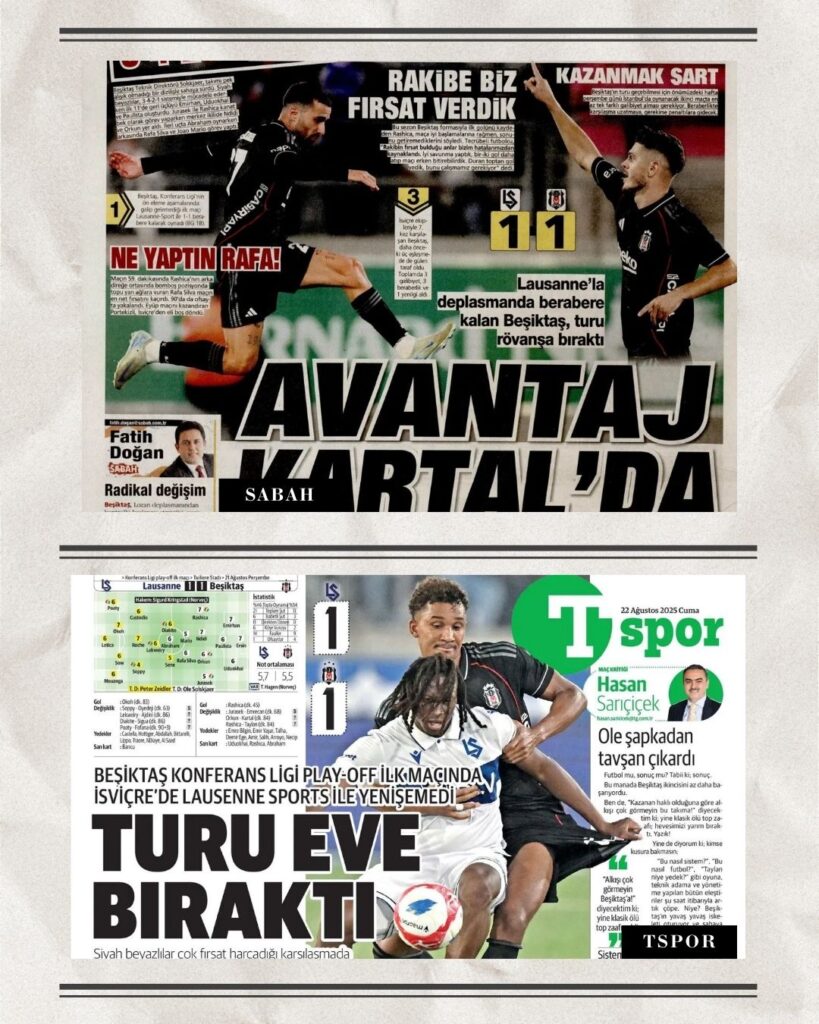 Dünki maçın ardından Beşiktaş, hem saha içindeki performansı hem de kulüp çevresindeki gelişmelerle spor basınının merkezine oturdu. Lausanne karşılaşmasına dair sert eleştiriler, Lausanne-Sport Teknik Direktörü Peter Zeidler’in İstanbul öncesi iddialı sözleri gazetelerin manşetlerine taşındı. Siyah-beyazlıların hem Avrupa macerası hem de transfer süreci, bugünkü spor sayfalarında farklı bakış açılarıyla değerlendirildi.