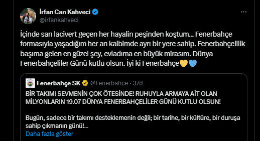 İrfan Can Kahveci, 19 Temmuz’u kutlamak için yaptığı paylaşımda, "İçinde sarı lacivert geçen her hayalin peşinden koştum… Fenerbahçe formasıyla yaşadığım her an kalbimde ayrı bir yere sahip. Fenerbahçelilik başıma gelen en güzel şey, evladıma en büyük mirasım. Dünya Fenerbahçeliler Günü kutlu olsun. İyi ki Fenerbahçe" ifadelerine yer verdi. Bu sözleriyle sarı lacivertli kulübe duyduğu derin sevgiyi bir kez daha gözler önüne serdi.