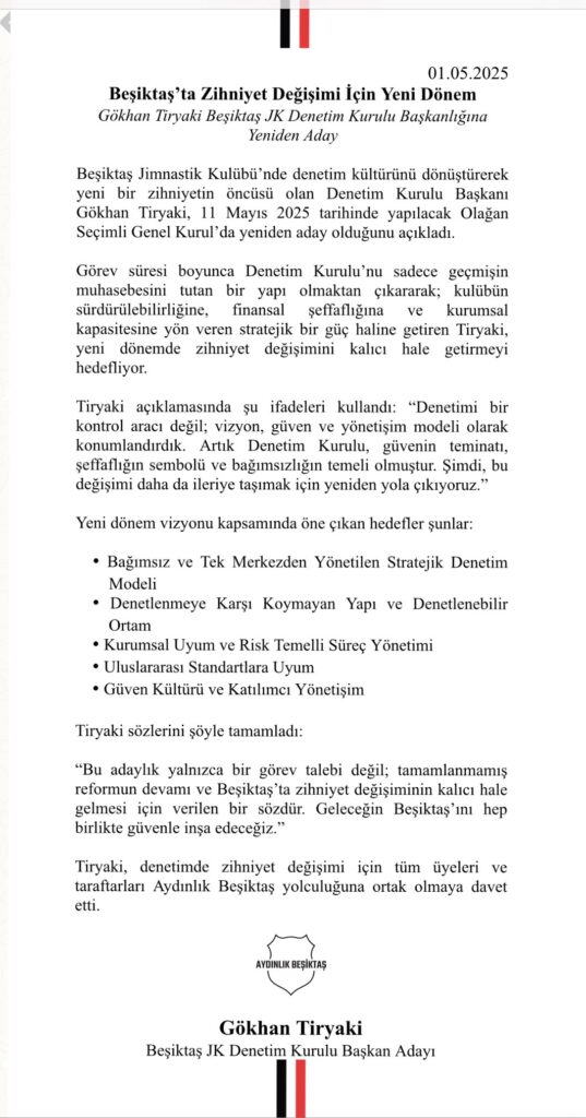 📌 “BJK Denetim Kurulu Başkanı Gökhan Tiryaki yeniden aday oldu.