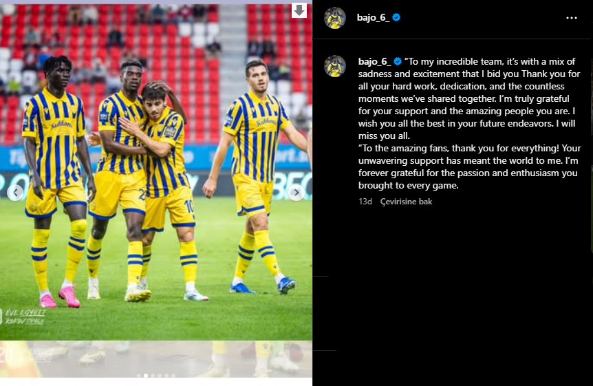 Son günlerde Beşiktaş ile adı sıkça anılan Mahmudu Bajo, sosyal medya hesabından dikkat çeken bir ayrılık mesajı paylaştı. Menajerinin İstanbul’da olduğu bilinen genç futbolcunun bu paylaşımı, Siyah-Beyazlı kulübe transfer olacağı yönündeki iddiaları güçlendirdi.