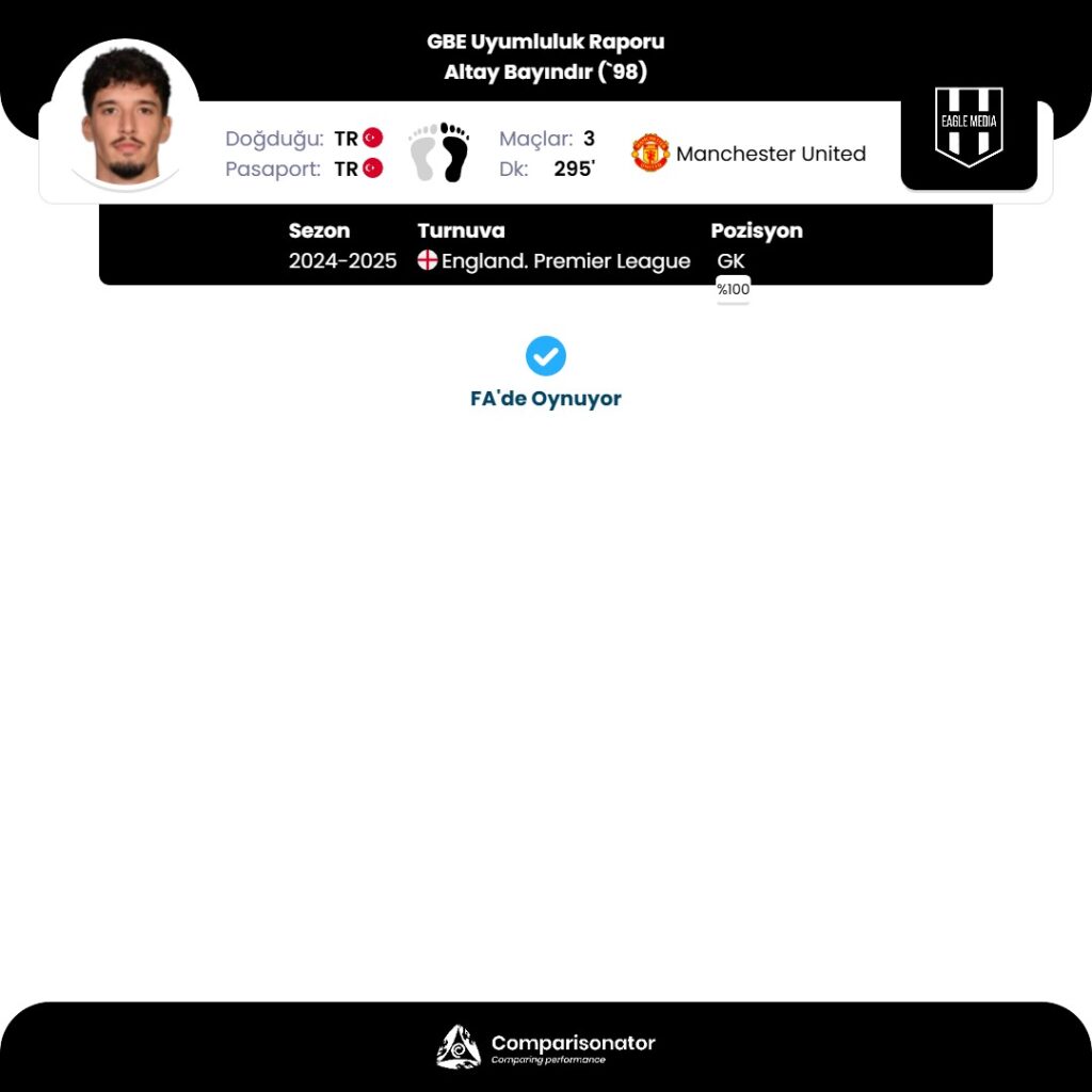 2024-2025 sezonunda Premier League’de 3 maça çıkan ve toplam 295 dakika süre alan Bayındır, İngiltere’de forma giyebilmesi için gerekli olan tüm yasal ve sportif şartları yerine getirmiş durumda. Comparisonator verilerine göre Bayındır, “FA’de oynuyor” onayıyla İngiltere’de resmen oynamaya hak kazanan oyuncular arasında yer alıyor.