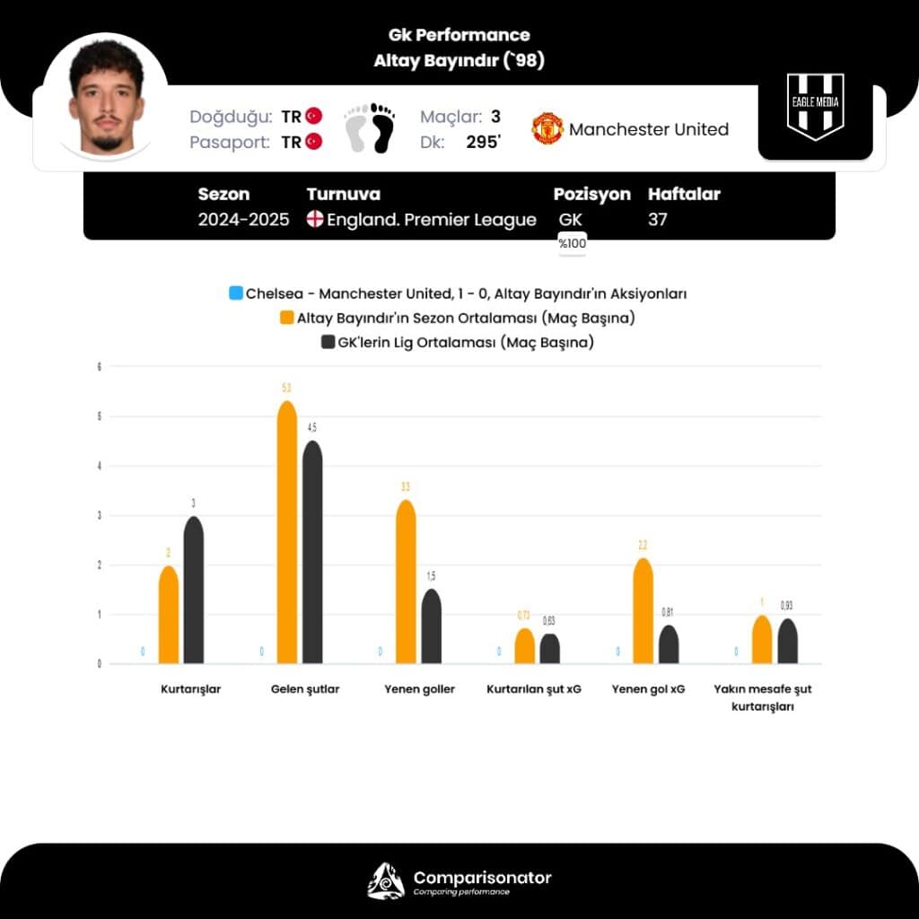 Manchester United’ın Türk kalecisi Altay Bayındır, 2024-2025 sezonunda Premier League’de sınırlı süre almasına rağmen performansıyla istatistiksel olarak analiz ediliyor.