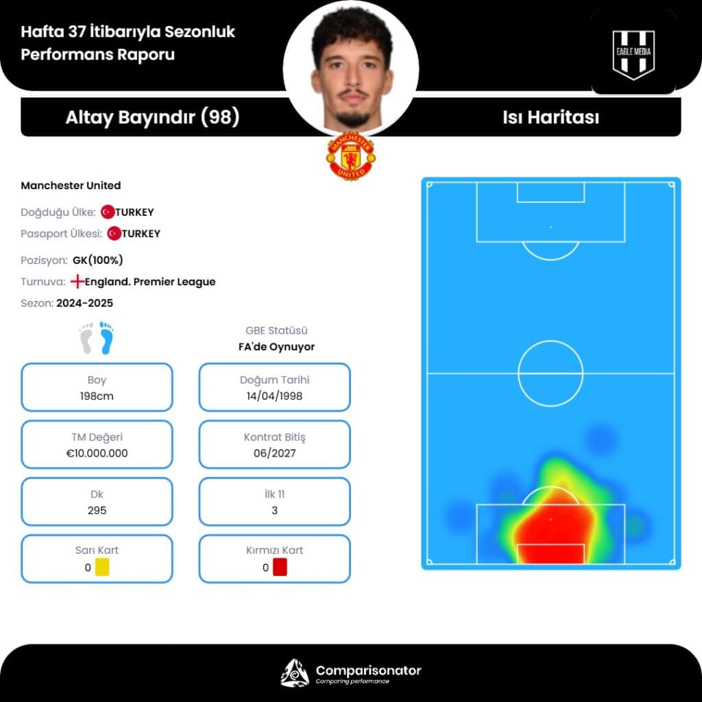 Manchester United forması giyen milli kaleci Altay Bayındır, 2024/25 sezonunun 37. haftası itibarıyla gösterdiği performansla dikkat çekiyor. Comparisonator tarafından hazırlanan sezona özel raporda, Bayındır’ın istatistikleri, kişisel bilgileri ve sahadaki ısı haritası yer aldı.