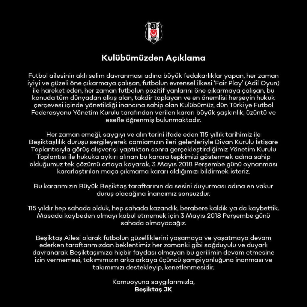 Her zaman emeği, saygıyı ve alın terini ifade eden 115 yıllık tarihimiz ile Beşiktaşlılık duruşu sergileyerek camiamızın ileri gelenleriyle Divan Kurulu İstişare Toplantısıyla görüş alışverişi yaptıktan sonra gerçekleştirdiğimiz Yönetim Kurulu Toplantısı ile, hukuka aykırı alınan bu karara tepkimizi göstermek adına sahip olduğumuz tek çözümü ortaya koyarak, 3 Mayıs 2018 Perşembe günü oynanması kararlaştırılan maça çıkmama kararı aldığımızı bildirmek isteriz.