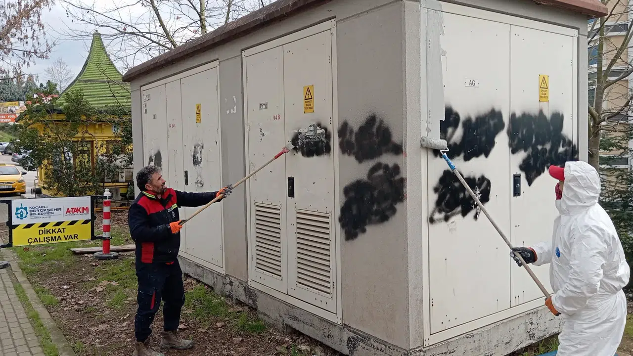 Kocaeli Büyükşehir Belediyesi, spreyle üzerine yazılar yazılan ve şekiller çizilen il genelindeki elektrik trafolarının temizliğini yaparak, şehrin estetik görünümüne katkı sağlıyor.