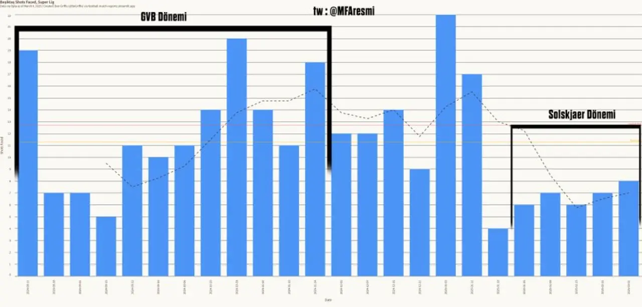 Beşiktaş artık Ole dönemiyle beraber daha iyi savunma yapmaya ve daha az şut yemeye başlamış. İlk birkaç hafta dışındaki en iyi dönemini yaşıyor. Ki zaten sarı çizgi takım ortalaması. Ortalamanın ne kadar altında kaldığını görüyoruz. Gayet iyi.