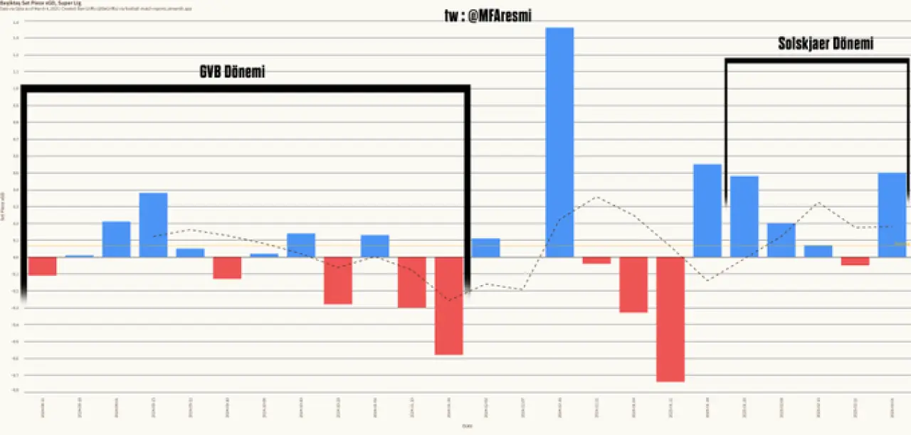 Duran toplarda yaratılan XGD farkı. Beşiktaş bu sezon duran toplardan çok az gol buldu ve çok fazla gol yedi. Bu grafiğe yansımış durumda.